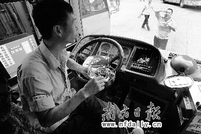 將近下午1點(diǎn),十幾位身著黑褲、淺藍(lán)襯衣的司機(jī)才端著餐盒,一陣?yán)峭袒⒀?他們都是站著,吃飯的速度驚人的快。房間里,6個(gè)不銹鋼的圓桶分別裝著米飯、菜肴、湯水,靠墻的架子上擺著一排排的飯盒、水壺———這座不起眼的狹長(zhǎng)的平房,既是司機(jī)發(fā)車(chē)簽到的地方,也是他們的臨時(shí)食堂。