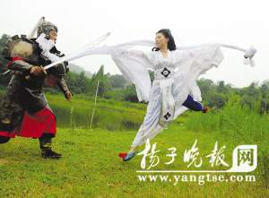 “江湖笑恩怨了,人過招心不老……”4日下午2點,南京江寧區(qū)南山湖景區(qū)儼然成了古裝戲的外景地,3對年輕男女在此像模像樣地演繹個性“私人電影劇照”,——將《神話》、《神雕俠侶》、《十面埋伏》等古裝武俠電影中的經(jīng)典場景翻版演繹,用他們的話說,著實圓了一回都市人的“成人童話夢”。