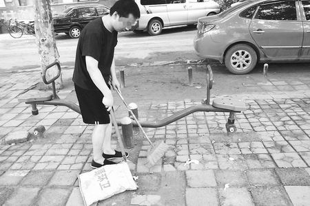 昨日上午11時,記者趕到鄭上路省紡機(jī)社區(qū)時,看見張?jiān)抡谇鍜咝^(qū)健身區(qū)的地面(如圖)。巡防隊(duì)員朱幸說,張?jiān)碌氖乱妶蠛蟮牡诙,他和?duì)友郭長河就成了張?jiān)录业某?,找他談心,?jīng)多次做工作,張?jiān)虏磐獾结t(yī)院治療。7月22日,在鄭州市第八人民醫(yī)院治療了一個月的張?jiān),康?fù)出院回家。到家后,張?jiān)氯圆辉赋鲩T,朱幸和郭長河又多次找張?jiān)铝奶。社區(qū)主任王曉波也主動到張?jiān)录遥刻焐习鄷r,他都要把張?jiān)陆械缴鐓^(qū),讓他幫忙干點(diǎn)零活。經(jīng)過溝通和交流,張?jiān)伦兊瞄_朗了許多,成了一名編外保潔員。王曉波說,社區(qū)為張?jiān)律暾堔k理了低保,讓他享受每月275元的最低生活保障! 跤浾呃顛箤(shí)習(xí)生吳瓊文首席記者閆化莊圖