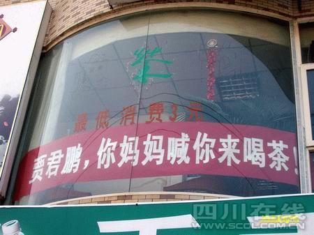 再三追問(wèn)下,來(lái)自重慶農(nóng)村的陳先生如實(shí)說(shuō),他平時(shí)喜歡上網(wǎng),看到“賈君鵬,你媽媽喊你回家吃飯”這句新的網(wǎng)絡(luò)流行語(yǔ)后,一下子勾起了自己童年的回憶,想起那個(gè)時(shí)候,每天傍晚,媽媽都要喊他回去吃飯的情景。而前兩天,他在網(wǎng)上看到一張照片,重慶的一家火鍋店竟然掛出一條橫幅,上面寫著:“賈君鵬,你媽媽喊你來(lái)吃火鍋!”他頓時(shí)靈機(jī)一動(dòng):“我為什么不能依葫蘆畫瓢,也掛一個(gè)橫幅呢?”“那為什么要寫成‘喝茶’呢?”陳先生說(shuō):“我這是茶樓,不管飯也不管吃火鍋,打麻將倒是可以,但總不能寫成‘賈君鵬,你媽媽喊你來(lái)打麻將’噻,所以就寫成來(lái)喝茶了。”至于這橫幅有沒有給茶樓打廣告的意思,陳先生坦言:“也許有一點(diǎn),但一來(lái)估計(jì)廣告的效果并不大,二來(lái)從自己的本意來(lái)說(shuō),娛樂的成分還要大過(guò)廣告的成分!