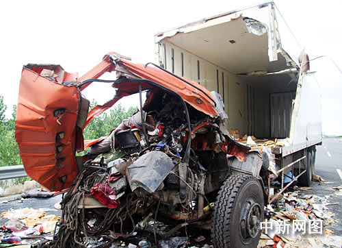 撞后面目全非的冷藏車。中新網(wǎng)發(fā) 童盛 攝
