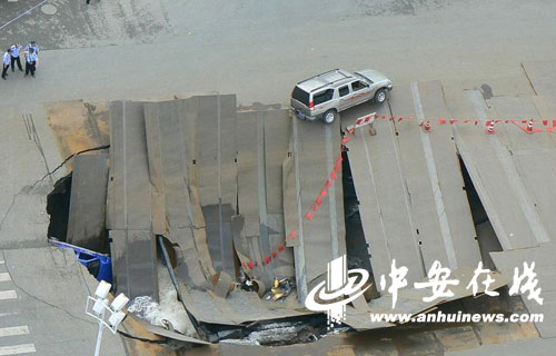 中新網(wǎng)合肥8月8日電(成展鵬 李君)今天中午一點(diǎn)二十分左右,安徽省合肥市長(zhǎng)江中路與徽州大道交叉口發(fā)生路面塌陷,塌方面積約半個(gè)籃球場(chǎng)大,有一輛汽車(chē)傾斜在塌陷洞旁的鋼板上。