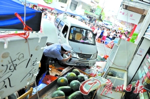昨日下午1時(shí)30分,禪城平桂街的麗晶市場,一輛面包車發(fā)瘋似的沖進(jìn)一個(gè)水果店,將路過此處的鄧松香老人撞飛幾米外,制衣廠女工阿玲則被碾在車下,面包車撞翻水果店,頂翻三臺冰柜,將老板娘胡金水從躺椅上撞下來。