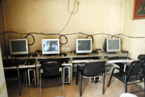 按照王先生的指引,昨天上午,記者來到了位于新中村的這家底商。只見大門上除了網(wǎng)吧兩個(gè)字之外,并沒有具體的招牌。走進(jìn)屋內(nèi),50多平方米的室內(nèi)擺有30多臺(tái)電腦。兩名20歲左右的男青年坐在控制室里負(fù)責(zé)收錢。此時(shí),一名中年男子走了進(jìn)來,對(duì)控制室內(nèi)的一名黃頭發(fā)青年說道:“網(wǎng)管,幫忙給上一下。你教過我的,可我沒記住!闭f完,兩人就很有默契的一起來到了靠近角落的一臺(tái)電腦旁。