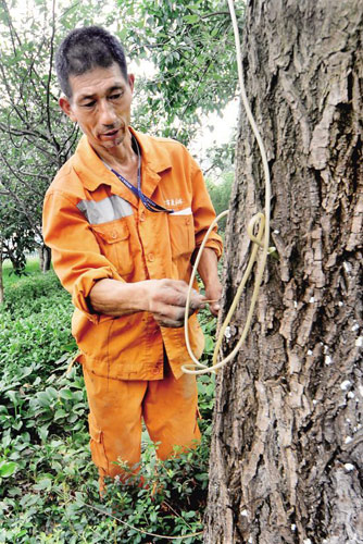 看著這些傷痕累累的大樹,江師傅心疼得流淚了,他往受傷的樹木身上抹了黑色的“愈傷涂抹劑”,希望大樹仰仗著幾十年的樹齡,能重新煥發(fā)生機(jī)。江師傅很難過:“我天天和這些樹在一起,現(xiàn)在它們受傷了,我想把它們救回來,可是,傷得這么重,誰知道還能不能存活啊!