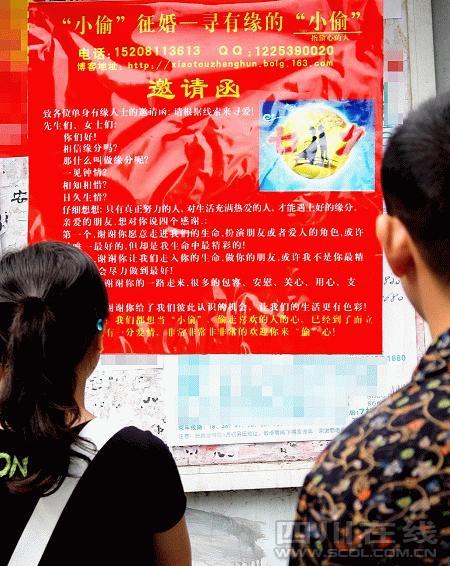 昨(25)日,沙灣路128號小區(qū)門口的告示欄里貼出一張大紅色的“邀請函”:“小偷征婚,征有緣小偷,共度七夕”、“小偷征小偷,生個小小偷!闭(dāng)圍觀者面露鄙夷時,有眼尖的市民發(fā)現(xiàn),此“小偷”非竊取錢財之輩,“別人是偷心的賊!