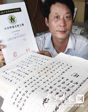 高淳縣椏溪鎮(zhèn)荊山村農(nóng)民張正福,利用6年時(shí)間反字倒抄紅樓夢全集,共120回,86萬字,并順利獲得大世界基尼斯之最證書(如左圖)。為了給附近村民修建一條長約一千米的水泥路,他決定將這些手抄本賣給有收藏條件的愛好者。