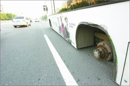 昨天下午6時,記者在大學路與長江路交叉口北約300米路西看到,車牌號為豫A90518的53路空調公交車車頭朝南,停在快車道上。其左后位置傾斜,車體觸及地面,車后的路面被劃出兩道約20米長的傷痕。兩個脫落的車輪放在公交車右側的花壇旁。在公交車內(nèi),一男一女兩人正在談論處理事宜。