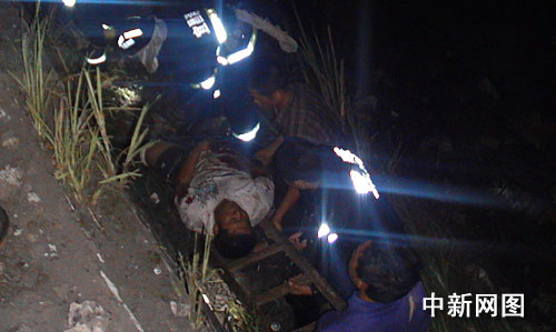 消防官兵在強(qiáng)光燈的引導(dǎo)下爬下懸崖,并在墜崖貨車不遠(yuǎn)處發(fā)現(xiàn)一名被甩出車外的傷者。傷者雙腿骨折,身上和頭部多處受傷。經(jīng)過二十分鐘的奮力營救,傷者終于被救援人員抬上救護(hù)車。