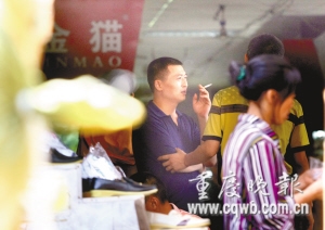 在1995年曾發(fā)生特大火災(zāi)的朝天門第三交易區(qū)6區(qū),一男子坐在自家衣褲攤前,叼根煙準(zhǔn)備點(diǎn)火。老婆正在看報(bào),出語(yǔ)阻止:“不要吸煙,要遭拘留!痹撃凶尤塘思s兩分鐘,終于還是把煙點(diǎn)起了。記者靠近拍照,女?dāng)傊鳈C(jī)警,趕緊用身子阻擋丈夫,并出手把丈夫的煙頭打掉。