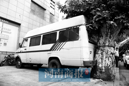 在鄭州市經(jīng)六路與緯三路交叉口附近,這輛白色依維柯車牌號(hào)為豫A69026,車頭朝東,距臨街建筑的墻壁大約有一米,車頭與墻之間被人“塞進(jìn)”了一輛三輪車。車尾朝西,緊緊貼住人行道邊的一棵樹。車身擺得很正,剛好把人行道堵死。
