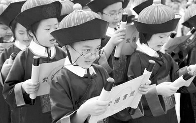 9月1日,杭州紫陽小學舉行了一場特別的新生入學儀式。小學新生穿戴著類似影視劇中的清朝衣服、帽子,手捧黃色書卷,誦讀入學三字經(jīng),向師長行禮。