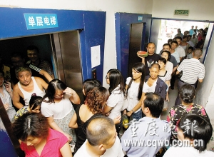 記者發(fā)現(xiàn),運(yùn)行的單層電梯只能容10人,運(yùn)行約10分鐘才能載客1次,每次上樓,要多擠兩三人,遇性急的年輕人插隊(duì),常與保安和排隊(duì)居民發(fā)生口角。