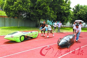 歷經(jīng)暑假兩個(gè)多月打造,外形如一顆黑色子彈、25毫升汽油可跑8000米的概念車“子彈頭”驚艷亮相,近日在華農(nóng)大操場(chǎng)進(jìn)行了性能測(cè)試。這輛車的制作團(tuán)隊(duì)主要由30多名大三大四學(xué)生組成,從制作配件到設(shè)計(jì)安裝全部手工完成。該車全長(zhǎng)3.2米,高70厘米,重約20公斤,由一人駕駛,時(shí)速可達(dá)40~50公里,本月下旬將赴上海參加一項(xiàng)節(jié)能車競(jìng)技大賽。