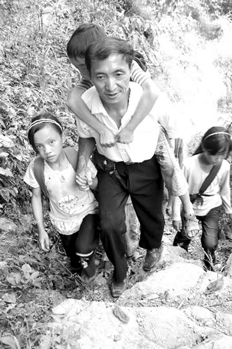 這是王正龍27年來唯一打的退堂鼓,仙峰苗族鄉(xiāng)中心校校長陳于強稱,對于王老師的“正常想法”,他們左右為難。“我舍不得孩子們,但是我一個大男人靠工資吃不飽飯,我還要孝敬老人、養(yǎng)兒養(yǎng)女!”王正龍的話“刺痛”了陳于強!澳悴淮n了,一時沒人接替你,我們只好撤掉兩個年級,有條件的孩子只能下山來讀!标愑趶姵聊艘魂嚭笳f。 “下山來讀?說得輕巧!蓖跽埣绷,這樣肯定有70%的孩子會輟學(xué),“我繼續(xù)教吧!山區(qū)的孩子不能沒有老師!”長嘆一口氣,王正龍又爬山路返回村小。