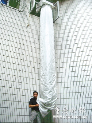 技術(shù)人員介紹,該布袋外層是防火纖維材料,平時(shí)不用可以折疊放在窗口鐵柜里。一旦發(fā)生火災(zāi),只需10多秒鐘就能打開,延伸到樓下,老人和小孩都可方便使用。若操作熟練,一分鐘可讓15人逃生。