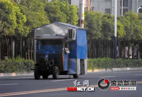 從房車的正面來看,該房的主體就完全顯露出來了,車的前部是一輛舊式手扶拖拉車,輪胎、水箱、傳動皮帶一應(yīng)俱全;中部是駕駛室主體,跟街頭常見的殘疾車一樣。主要由駕駛室、前面檔風(fēng)玻璃、觀后鏡,一樣都不少,更讓人稱奇的是這輛房車騎駛室頂端(即觀后鏡上方),裝著一臺空調(diào)掛機的主機,顯示這臺房車即便是在炎熱的夏天,也依然能照常使用。房車后部則是主體部分,鋁合金制的車廂、三角形車頂、兩個后輪,構(gòu)成一輛移動的房車。