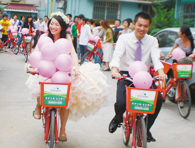 昨天,一支飛揚著彩色氣球的公共自行車隊,在西湖文化廣場集結(jié)。新郎麥田與新娘小A騎公共自行車步入婚姻殿堂。