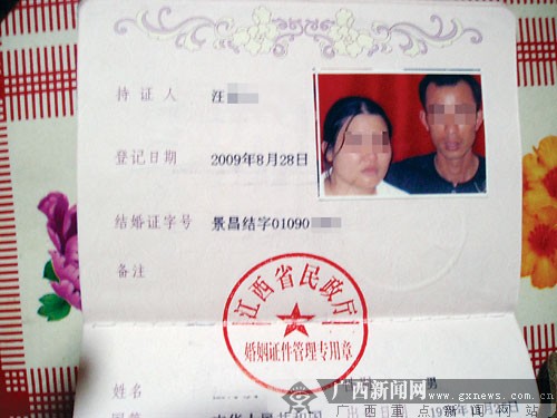 隨后,兩人帶來了一個(gè)年輕女子。從女子出具的身份證和戶口本上得知,她叫張×蘭,廣西賓陽人,今年28歲。見該女子模樣不錯(cuò),汪家心生喜歡。8月28日,汪先生支付了幾千元介紹費(fèi)給中間人后,和張×蘭到當(dāng)?shù)鼗橐龅怯洐C(jī)關(guān)進(jìn)行了登記。