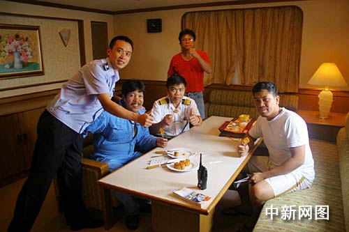 “趕快讓大家都過來,有月餅吃!贝L告訴助手,十幾個(gè)船員陸陸續(xù)續(xù)來到船長辦公室,狹小的船艙一下子熱鬧起來。“Give me one.”(給我一塊。)“It’s delicious.”(真好吃。)