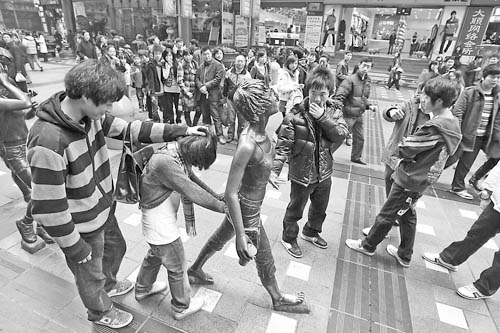 北京女孩清越去年6月28日參加了一次“定格”:大家隨意在路上走,一個(gè)信號(hào)發(fā)出來(lái),參加活動(dòng)的人就保持不動(dòng),持續(xù)3~5分鐘。“我們想和周圍的行人形成動(dòng)靜的對(duì)比,純粹就是好玩。”參與者全從網(wǎng)上召集,活動(dòng)那天來(lái)了將近200人。