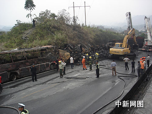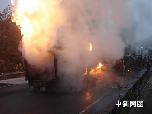 由于集裝箱上滿載約十八噸的膠水和家俱,碰撞后很快起火,大客車與運(yùn)礦大貨車亦不能幸免。南丹消防官兵接警趕至?xí)r,發(fā)現(xiàn)現(xiàn)場火光沖天成了火海,其中集裝箱大卡車正猛烈燃燒,而大客車和運(yùn)礦大貨車不久后也被燒成廢鐵。消防官兵隨后出動水槍滅火,四輛消防水車頻繁往返縣城運(yùn)水達(dá)二十多車次。救援工作至十八日下午六時許才結(jié)束。