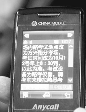 “場地考試點改為方興路分考場,請于10月1日至8日早上8:30到考場進(jìn)行場內(nèi)路模擬,合格后方可參加考試!眹鴳c節(jié)前夕,很多參加駕駛證直考的考生收到了這樣一條短信,短信后附有考試地址和聯(lián)系電話。