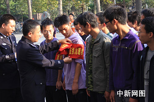 中新網(wǎng)鄭州10月23日電 (記者 晏立海 馬雯雯)10月23日下午,鄭州市反扒支隊(duì)一大隊(duì)的反扒高手們來(lái)到河南農(nóng)業(yè)大學(xué),教授百名學(xué)生反扒技巧。這是鄭州市公安局反扒支隊(duì)向社會(huì)招聘2000名大學(xué)生反扒志愿者的首批學(xué)員,這些大學(xué)生們經(jīng)過(guò)培訓(xùn),10月24日將走上街頭協(xié)助反扒民警抓小偷。