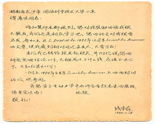 錢學(xué)森在1996年5月19日寫給譚暑生的最后一封親筆信中說:“對您近年來的不斷探索精神,我要表示敬意!但我非此道行家,不能再說更多的話……”