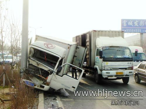 今日10時(shí)許,在哈市哈平路農(nóng)機(jī)研究院路段,一輛白色廂式貨車行駛中前方車輛突然減速,貨車剎車不及只能轉(zhuǎn)向躲避,沖上路面的隔離帶撞到一根鐵柱方才停下。貨車駕駛室嚴(yán)重變形,破碎的風(fēng)擋玻璃和機(jī)器零件散落一地,司機(jī)大腿被卡住。