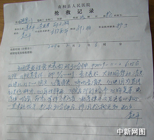 記者在南和縣人民醫(yī)院見(jiàn)到陳雪川的“搶救記錄”,記錄顯示:主因突發(fā)性意識(shí)喪失約30分鐘,于2009年11月2日6時(shí)05分入院,入院查體,意識(shí)喪失,大動(dòng)脈搏動(dòng)消失,雙瞳孔約5mm,固定,心音消失,呼吸音消失,心電圖為直線,初步診斷為心源性猝死,入院后給予綜合搶救,電復(fù)率4次后患者心跳一直未能恢復(fù),搶救30分鐘后,終因搶救無(wú)效,死亡。