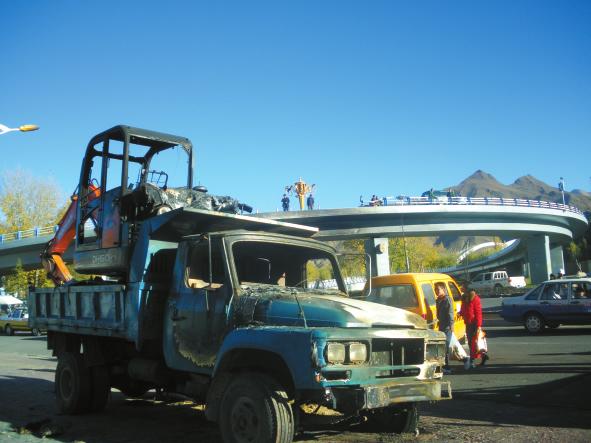 記者在事故現場看到,一輛被燒成空架的東風車及被燒過的裝載機放置在路邊,立交橋的欄桿已被撞出一個寬大的口子,橋下3柱景觀路燈也被燒壞。橋下地面還殘留著大片油漬,旁邊被大火殃及的工商部門辦公樓燒毀嚴重。清理現場的工作人員正在對一些危險建筑物進行拆除,并對現場油污進行清理。