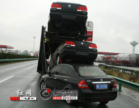 當(dāng)日下午4點(diǎn)20分左右,高速交警邵懷大隊隆回中隊民警黃始杰、羅權(quán)趕到事發(fā)現(xiàn)場,在由東往西方向的洞口服務(wù)區(qū)入口處,一輛牌號為湘E1B1**的尼桑小車一頭撞進(jìn)牌號為吉A955**的掛車尾部,將掛車車尾所裝載的捷達(dá)小車高高的頂起,而尼桑小車的左前輪在劇烈的撞擊下已經(jīng)破裂。