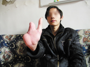 “我當(dāng)時(shí)疼極了!看到自己的4根手指已經(jīng)沒了,我心里特別害怕!”在這條生產(chǎn)線上工作的,都是小東的親屬。事發(fā)后,在舅姥爺?shù)膸ьI(lǐng)下,親屬們緊急將小東送到附近醫(yī)院。公司老板此時(shí)也得知了情況,并讓小東親屬將其轉(zhuǎn)到天津醫(yī)院進(jìn)行治療。在搶救期間,小東的親屬將找到的四根手指帶到了醫(yī)院。但因?yàn)槭种敢阉,而且粘上了很多橡膠,已經(jīng)無法進(jìn)行再植手術(shù)了。住院十余日后,小東出院了?粗皇O掳雮(gè)手掌的右手,小東多次掉下眼淚。