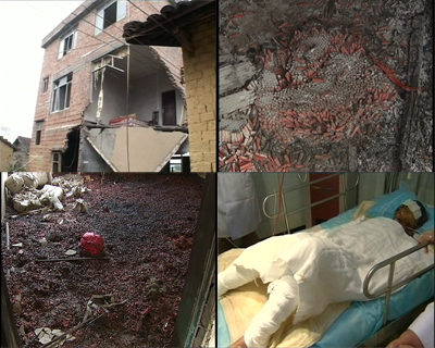 記者:“在這個事故現(xiàn)場,我們也可以看到這里已經(jīng)是一片狼藉,這個樓馬上已經(jīng)要塌陷了,這個地上到處布滿了炮筒,這些應(yīng)該是一盤已經(jīng)裝好火藥的煙花,這里我們看到滿地都是炮筒,這個房間正是布滿了整整一層的炮筒,在現(xiàn)場我們注意到有這樣一口鐘,我注意到時針指得是7點46分,也就是說這口鐘將永遠(yuǎn)將定格在11月12日7點46分事故發(fā)生的那個時間!