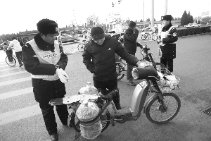 昨日下午,天壇東門路口。一輛闖紅燈的電動(dòng)自行車騎車人被交警攔下時(shí),交了20元罰款。5分鐘內(nèi),天壇東門路口接連攔下三輛電動(dòng)自行車,另兩人均因違法載物———車上綁有大個(gè)桶裝水,受到20元罰款處罰。其中一人表示,剛知道電動(dòng)自行車不得載人載物。