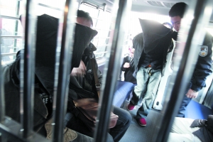 昨日上午,T232次列車(chē)進(jìn)站,旅客中有一群戴著手銬、蒙著頭套的特殊旅客,他們?cè)诿窬垂芟卤谎荷暇?chē)。