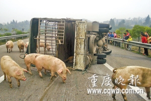 昨日,豬販汪祥全受到處罰。來自市高速公路支隊的消息稱,近幾年,高速公路上不時出現(xiàn)運輸生豬貨車翻車后豬群亂串的狀況,其中曾有100多頭豬在成渝高速路亂串,先后引發(fā)4起車禍、3人受傷,道路封閉4小時。