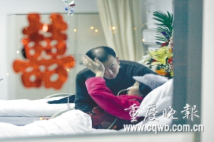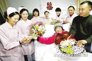 女子叫蔣翠,今年38歲。男人叫張兵,今年44歲。張兵推著妻子,輪椅軋過紅地毯,迎著空中的花瓣,進(jìn)入病房!白8D銈,你們讓我們懂得了攜手到老的承諾!贬t(yī)生護(hù)士共同祝賀夫妻倆,希望他們“新婚”快樂?粗贾贸尚路康牟》浚Y翠哭出了聲音!跋M銈兡軋(jiān)持下去,恩愛永遠(yuǎn)。”武警總隊(duì)醫(yī)院醫(yī)務(wù)處主任向貴平擔(dān)當(dāng)起了主婚人的職務(wù),向夫妻頒發(fā)了結(jié)婚證。這張結(jié)婚證也傾注了醫(yī)院醫(yī)生護(hù)士的心血。通過和南岸區(qū)民政局聯(lián)系、溝通,婚姻登記處工作人員特地到病房,為蔣翠辦理了結(jié)婚證。