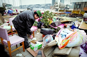 昨日上午9時許,百子灣家園東側(cè)空地上圍起警戒線。四五十名住戶不肯離去,身旁堆著鍋碗瓢盆、被褥、衣物等。“房子被拆了,晚上都不知住哪兒。”一位婦女坐在自家被褥上哭了起來。她懷中3歲女孩穿著單薄毛衣,凍得直流鼻涕。