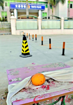 在交警中隊大樓的大堂里,陳錄生的照片仍然掛在公告欄內(nèi),相片與十幾名“初級警員”排列在同一行,但職務(wù)一欄已成空白。而在大樓對面,記者看到陳錄生家屬設(shè)置的“靈堂”仍未撤走,靈堂由一個藍色的架子搭建而成,架子下擺著一張小桌子,桌子上還有幾個水果。桌子旁邊則有一個爐子,地上還殘留著爆竹。