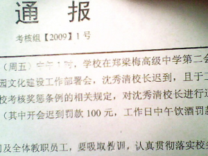 11日下午1時(shí),淮安市漣水縣鄭梁梅高級中學(xué)開會,校長沈秀清因遲到且當(dāng)日中午飲酒,被該校崗位獎懲考核組罰款600元,并通報(bào)批評。事情發(fā)生后,有網(wǎng)友將該校對沈校長的《通報(bào)》發(fā)到網(wǎng)上,一時(shí)間,網(wǎng)友對該通報(bào)的真實(shí)性及校長是以身作則、還是校方自我炒作提出質(zhì)疑。