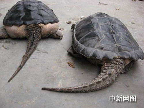 于先生把兩件“寶物”拿到室外讓我們觀賞。由于時(shí)下已是冬季,它們正處于半冬眠狀態(tài),趴在地上慢慢蠕動(dòng),對(duì)圍觀的群眾投以好奇的目光。個(gè)頭較大的那只,不停張嘴覬覦著四周。經(jīng)仔細(xì)觀察,其長(zhǎng)相集龜和鱷魚(yú)于一體,尤其是粗壯的尾巴,與鱷魚(yú)的尾巴無(wú)疑。體長(zhǎng)一尺有余,背殼直徑二十多厘米,上有三條凸起的三角形棱脊,并有放射狀斑紋。頭部較粗大,不能完全縮人殼內(nèi),脖短長(zhǎng)有褐色肉刺,尾巴尖而長(zhǎng),長(zhǎng)有肉突刺,爪子尖而有力。