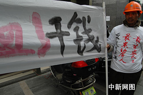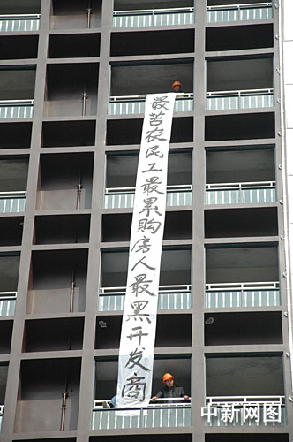 中新網(wǎng)貴港12月16日電 (記者 王剛)16日早,廣西貴港市數(shù)十農(nóng)民工爬上該市市區(qū)最高樓盤(pán)“聯(lián)邦國(guó)際”欲跳樓討薪,情緒激動(dòng)的民工還掛出“最苦農(nóng)民工、最累購(gòu)房人、最黑開(kāi)發(fā)商”、“還我血汗錢(qián)”等橫幅聲討開(kāi)發(fā)商。