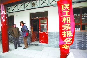 今天上午9時(shí)許,略顯冷清的望京公園里,幾條帶著相親標(biāo)語的紅色橫幅旁,時(shí)不時(shí)會有幾個(gè)晨練者走過。民工相親會的組織者們在公園管理處的辦公室里靜待相親者。盡管此后的一小時(shí)里,先后有10余名相親者魚貫而入,但令人擔(dān)心的一幕還是發(fā)生了,前來相親的基本都是男性。
