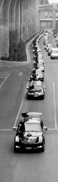 中午12點(diǎn),這個(gè)婚車隊(duì)又出現(xiàn)在了穿金路上。一輛凱迪拉克越野車排在車隊(duì)最前方,負(fù)責(zé)開道和攝像。新郎、新娘乘坐的加長(zhǎng)林肯緊隨其后,7輛奔馳S350和1輛奔馳320行駛在車隊(duì)靠前方陣,7輛寶馬X5和3輛凱迪拉克位于車隊(duì)中間,3輛保時(shí)捷卡宴押后。這些車輛除兩輛為重慶牌照、一輛為廣州牌照外,其余車輛均掛著昆明本地車輛號(hào)牌。車內(nèi)的人不時(shí)搖下車窗,幾乎所有車輛上的司機(jī)和乘客都是年輕人,其中不乏剃著光頭的時(shí)尚潮人。