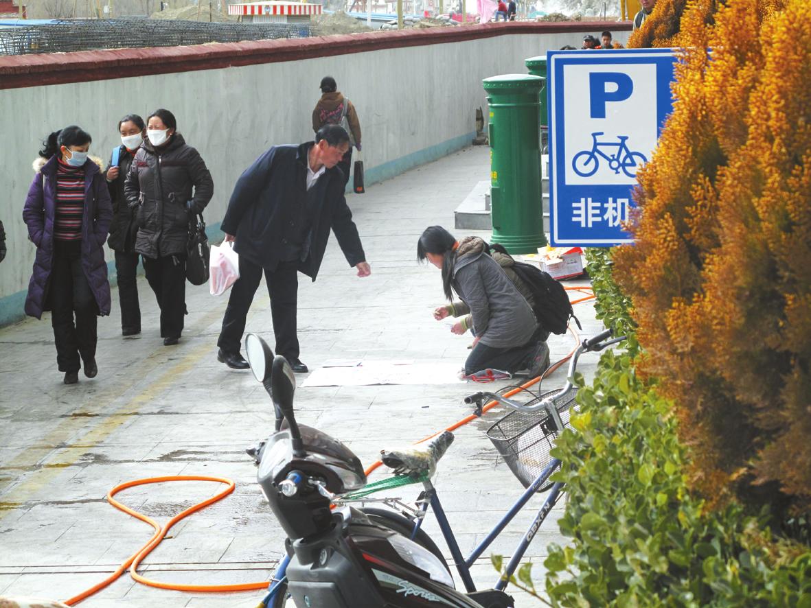 然而,當(dāng)其中一個女孩看到記者正在遠(yuǎn)處掏出相機(jī)拍照時,顧不得接過市民遞過來的錢,連忙用手遮著臉,拉著另一個女孩迅速站起來收拾東西,然后飛快地離開了現(xiàn)場。