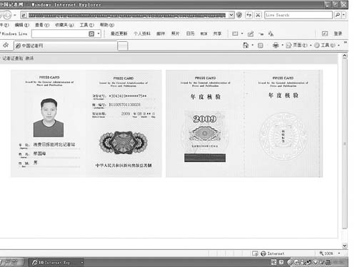 盡管公開信息顯示,石家莊市裕華區(qū)人民法院已于2009年9月對蔡國海作出了有期徒刑3年緩刑5年的判決,但2010年1月26日,記者還是在中國記者網(wǎng)的“記者證查驗系統(tǒng)”中找到了蔡國海的名字。查詢結(jié)果顯示,蔡國海的記者證辦證日期為2009年8月,并通過了這一年的年度核驗。在中國記者網(wǎng)“新聞機構(gòu)”查詢系統(tǒng)中,蔡國海仍是《消費日報》河北記者站的記者。