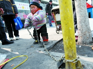 事件:因家中孩子無(wú)人照看,一名開(kāi)摩的男子將兩歲的兒子用鐵鏈拴在路邊柱子上。