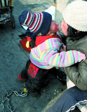 昨日,房山良鄉(xiāng)華冠購(gòu)物中心西側(cè),陳傳六正在趴活,臉上有多處凍瘡。距摩的兩米遠(yuǎn)的路牌子下鋪著紙板,放著簡(jiǎn)易童車(chē)。他兩歲的兒子坐在紙板上喝著冷奶,奶嘴發(fā)黑。一名黑車(chē)司機(jī)朝小孩喊“金蛋兒”,小孩朝他笑。